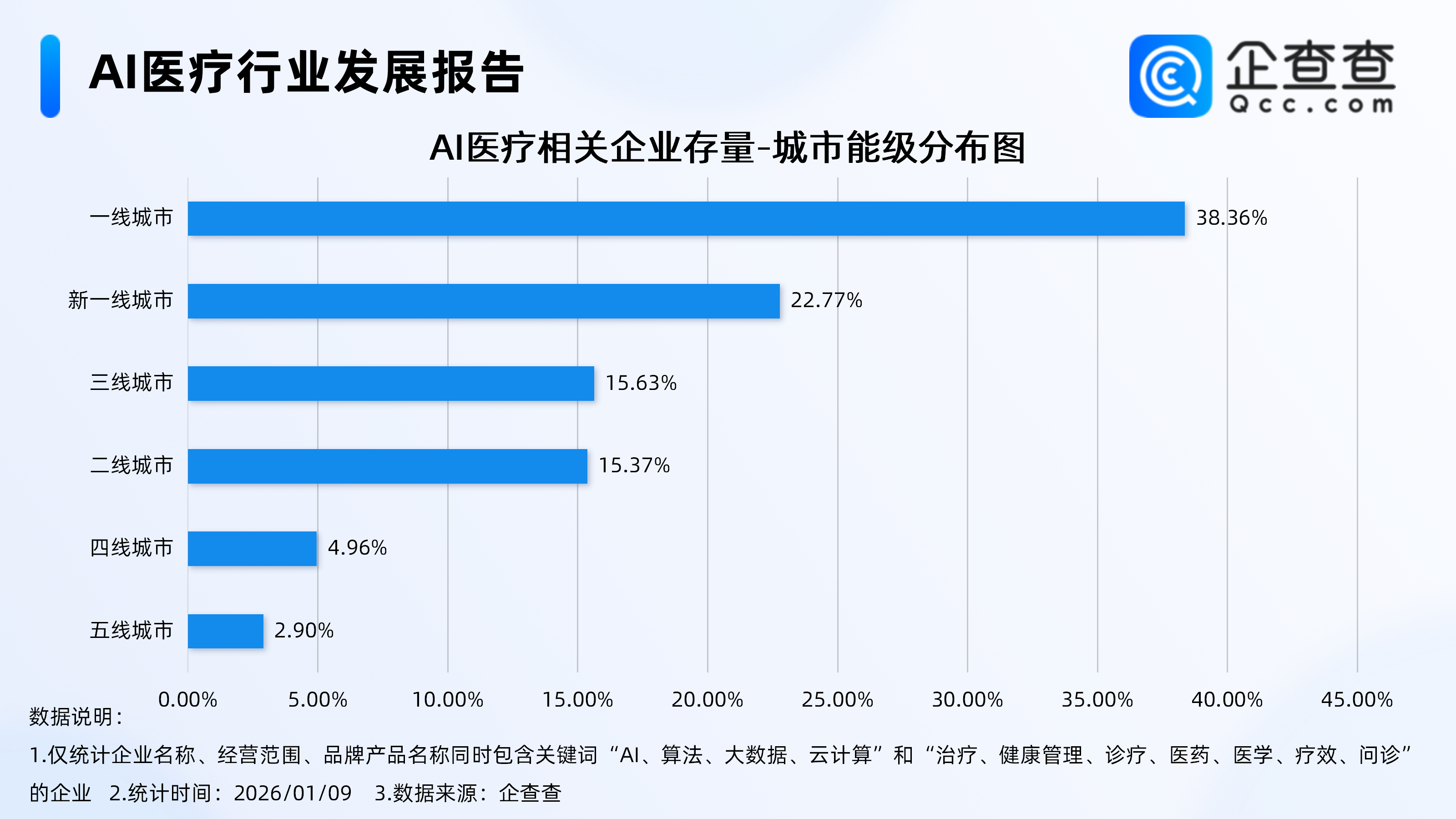 企查查数据显示,截至1月9日,国内现存AI医疗相关企业10.8万家。近十年AI医疗相关企业注册量呈整体增长态势,其中2023年全年注册量首次突破2万家,同比增长45.59%至2.19万家,达近十年注册量第一个峰值。2025年全年注册2.48万家,同比增长22.38%,创近十年注册量新高。2.现存AI医疗相关企业多分布在一线城市