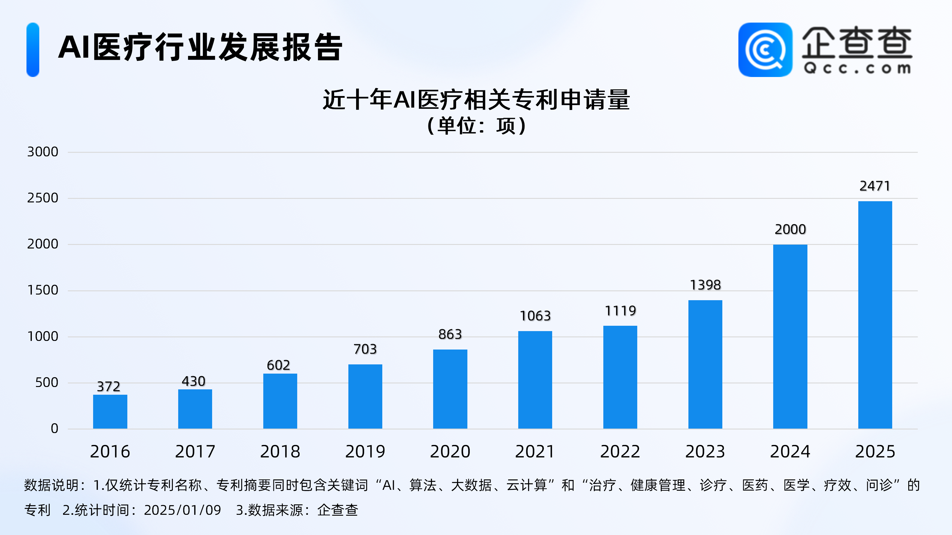 企查查数据显示,截至目前,国内现存1.28万项AI医疗相关专利。近十年AI医疗相关专利申请量持续增长,2024年全年申请量首次达2000项,2025年全年申请量为2471项,创申请量新高。