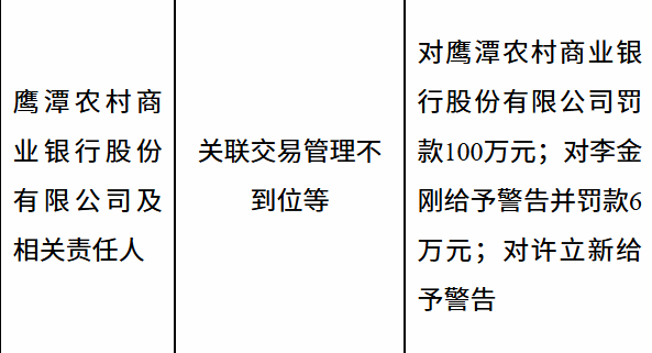 1月9日,国家金融监督管理总局鹰潭监管分局行政处罚信息公开表显示,鹰潭农村商业银行股份有限公司因关联交易管理不到位等被罚款100万元;责任人李某刚被给予警告并罚款6万元;许某新被给予警告。